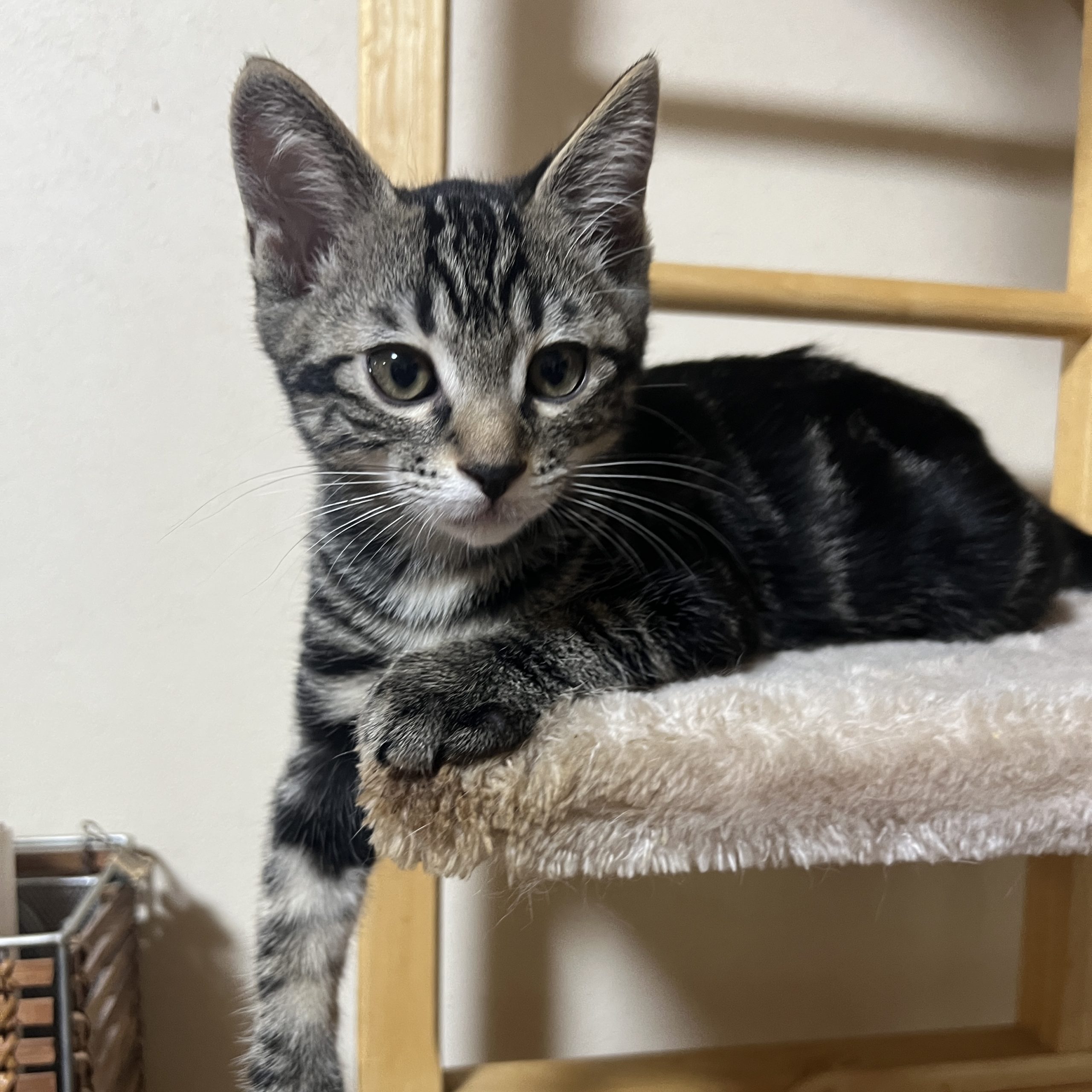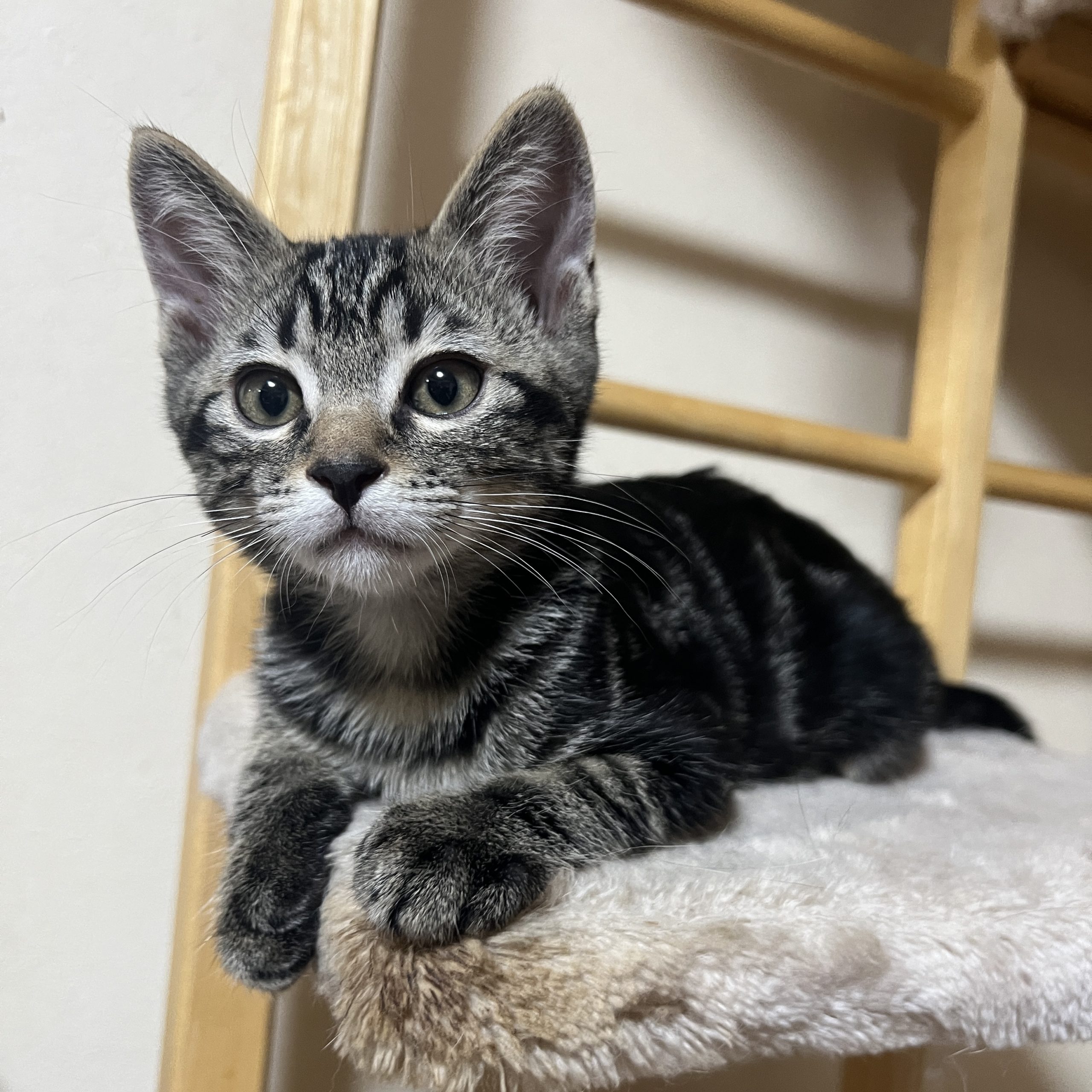 アメショ風柄スレンダーボディのキジトラくんです。撫でたらゴロゴロの人慣れバッチリ、遊びが大好きで活発な性格です。体調を崩すことなく食欲もあって元気いっぱい!最近は肩乗りが得意になり、髪ゴムをはずそうとしたりと何にでも興味深々なので、お部屋はお片付けが進みそうです。まだ小さい子猫さんなのでお留守番のないご家庭が希望です。