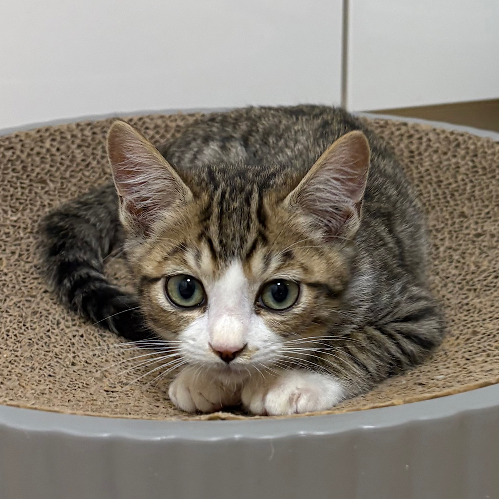 - 少し明るい茶色の混ざったきじ白の毛並みと、手袋と眼力強めの目元がチャームポイントです。