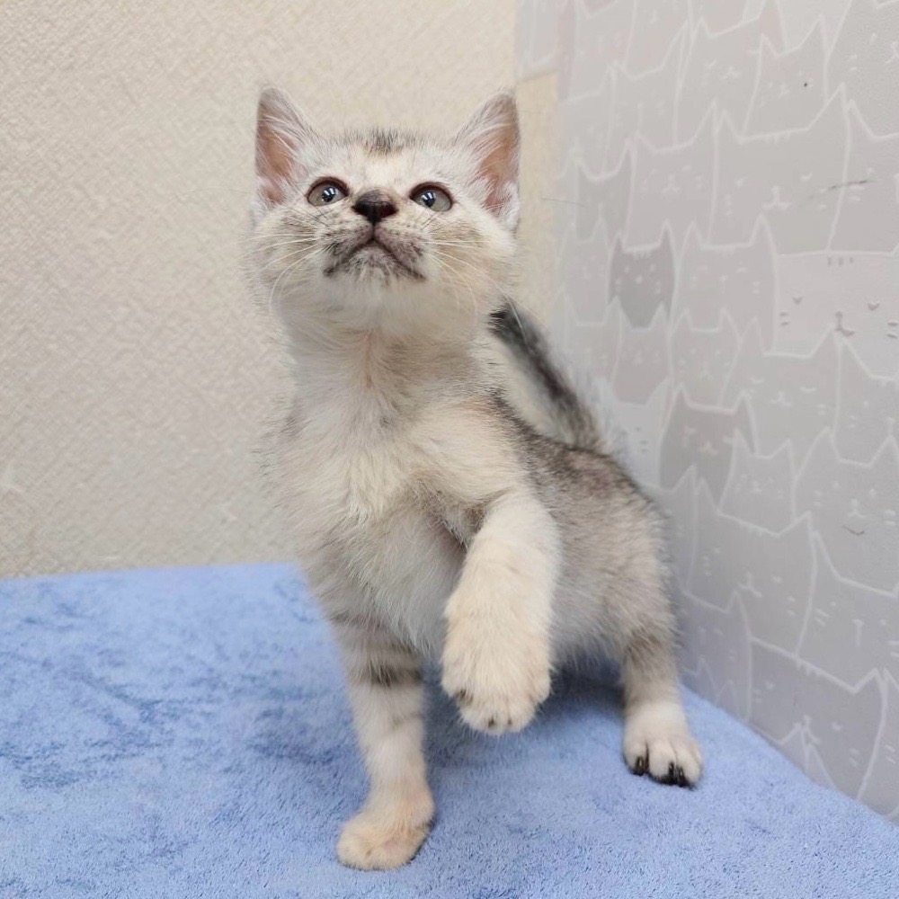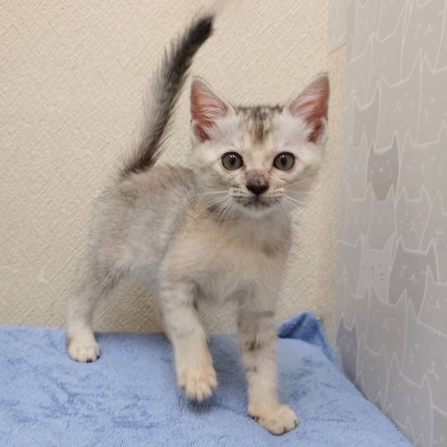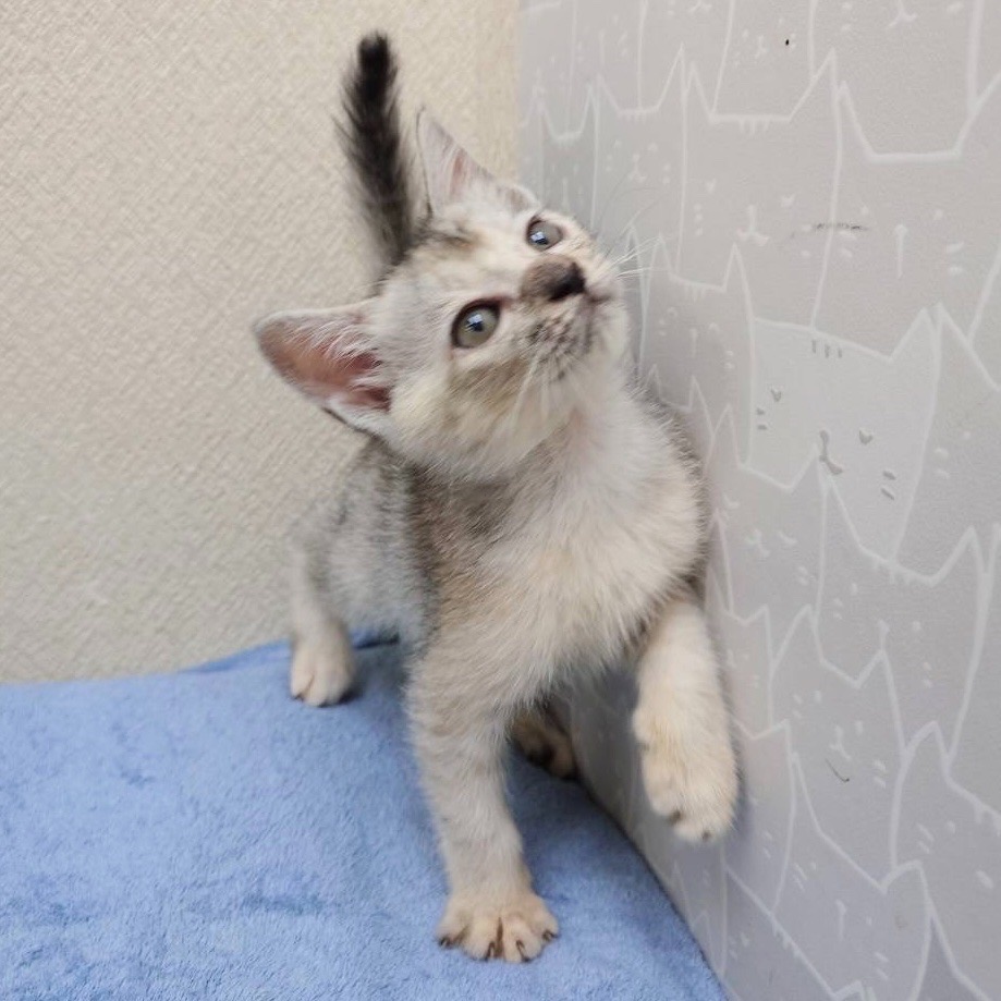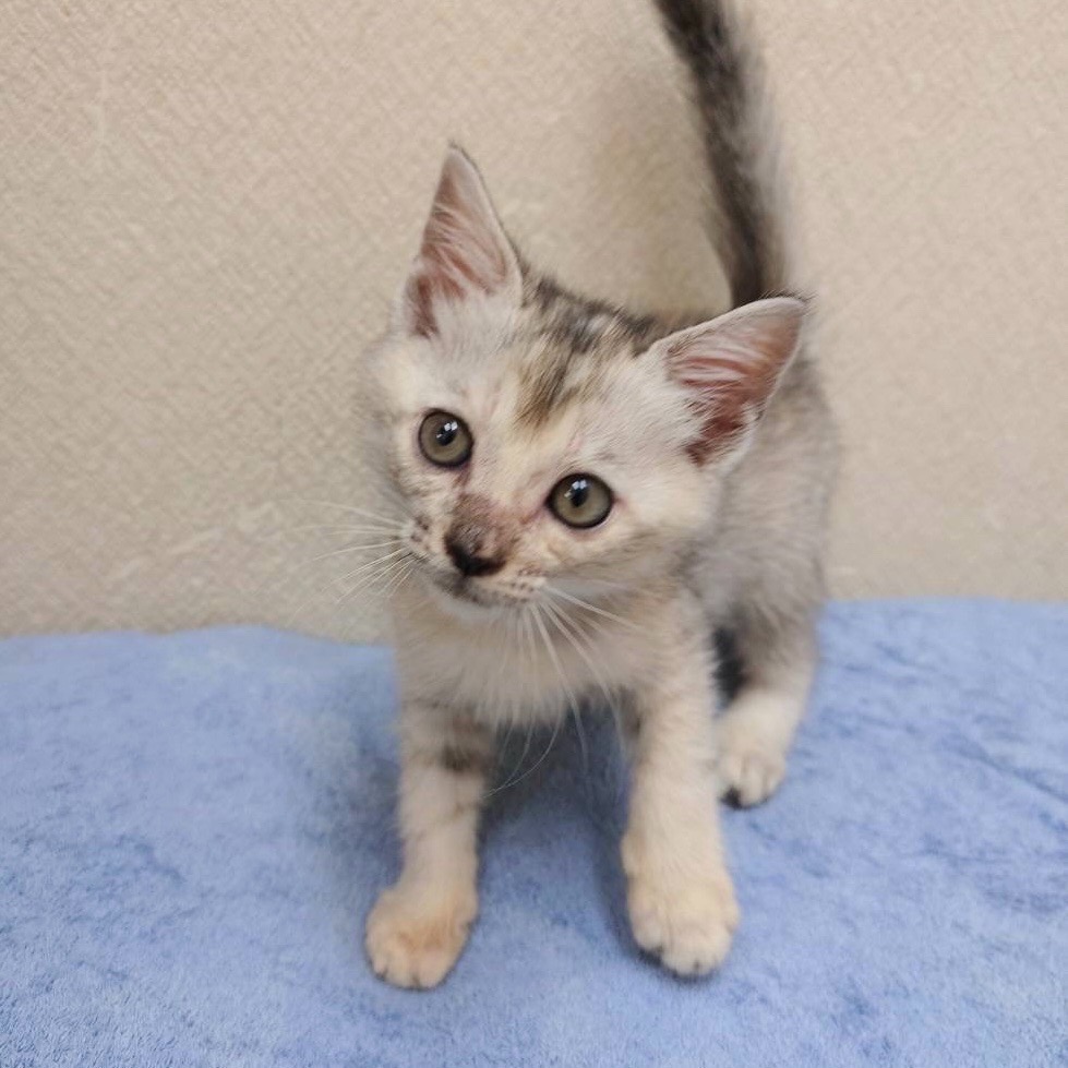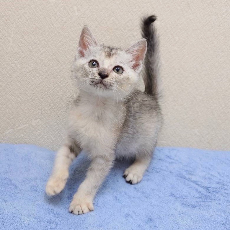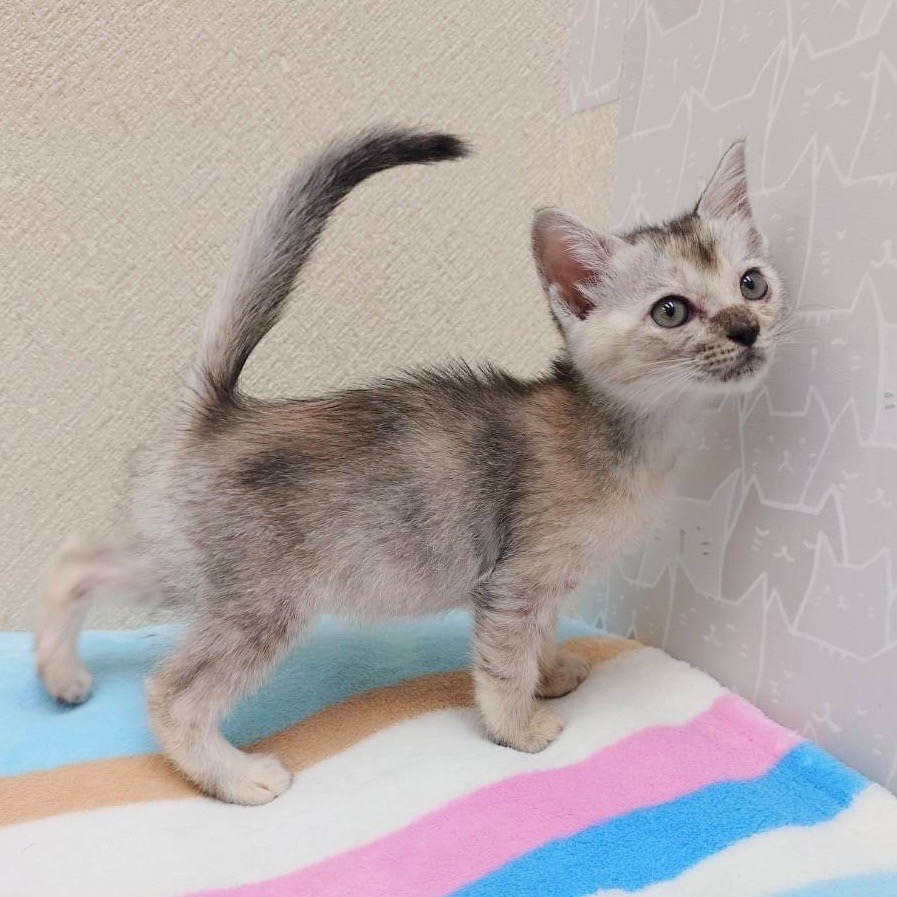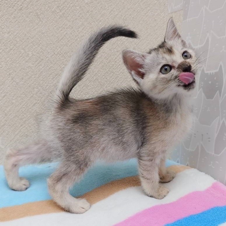 個性的なパステルミケのレイヤーちゃん。女の子ですがとても好奇心が旺盛で活発で物おじしないタイプ。兄妹たちと仲良く全力で遊んでいます。食欲も旺盛で、いつもご飯が来るのをケージの扉の前で張り付き待っています(笑)ムースなどはまだ吸い食べをしてしまうことも多く、お口周りやお鼻あたりが茶色く汚れがちで拭いてもなかなか落ちず。段々と綺麗になると思います。まだまだ小さい子猫さんなので、これからますます個性が出てくると思います。どんな子に育つか保護主もとても楽しみです。
