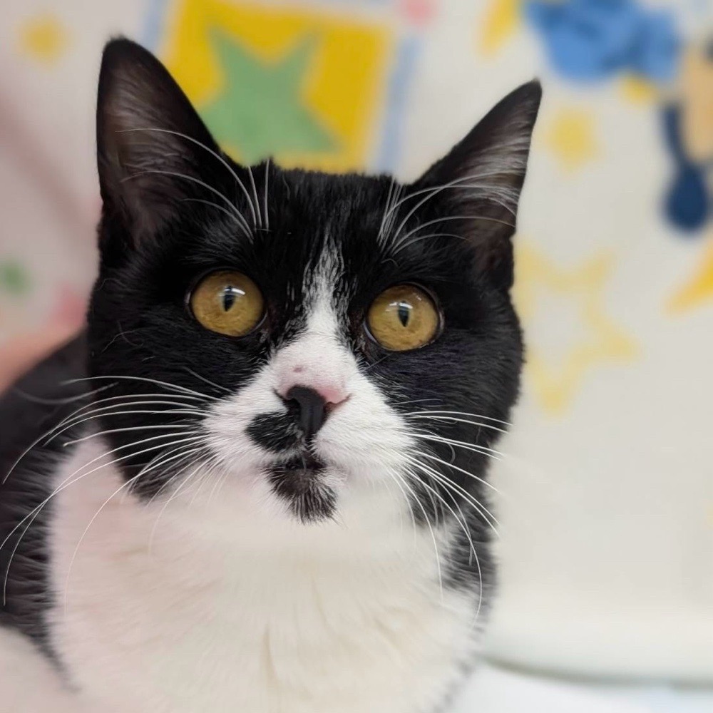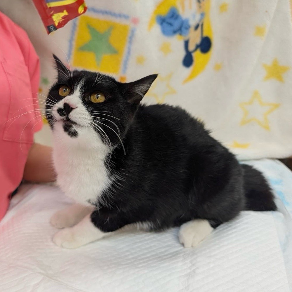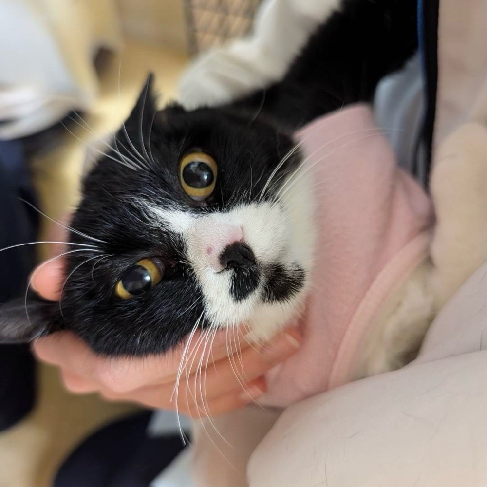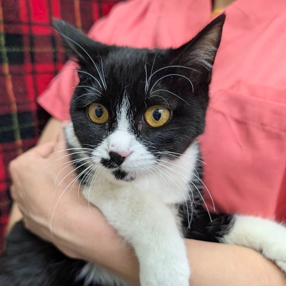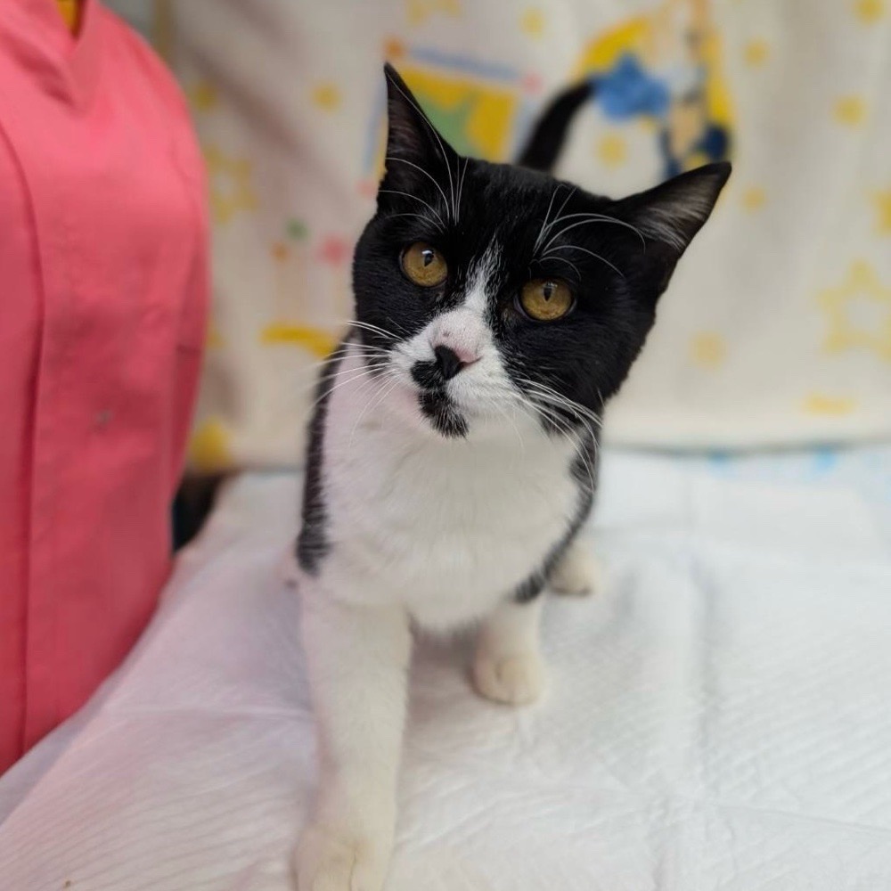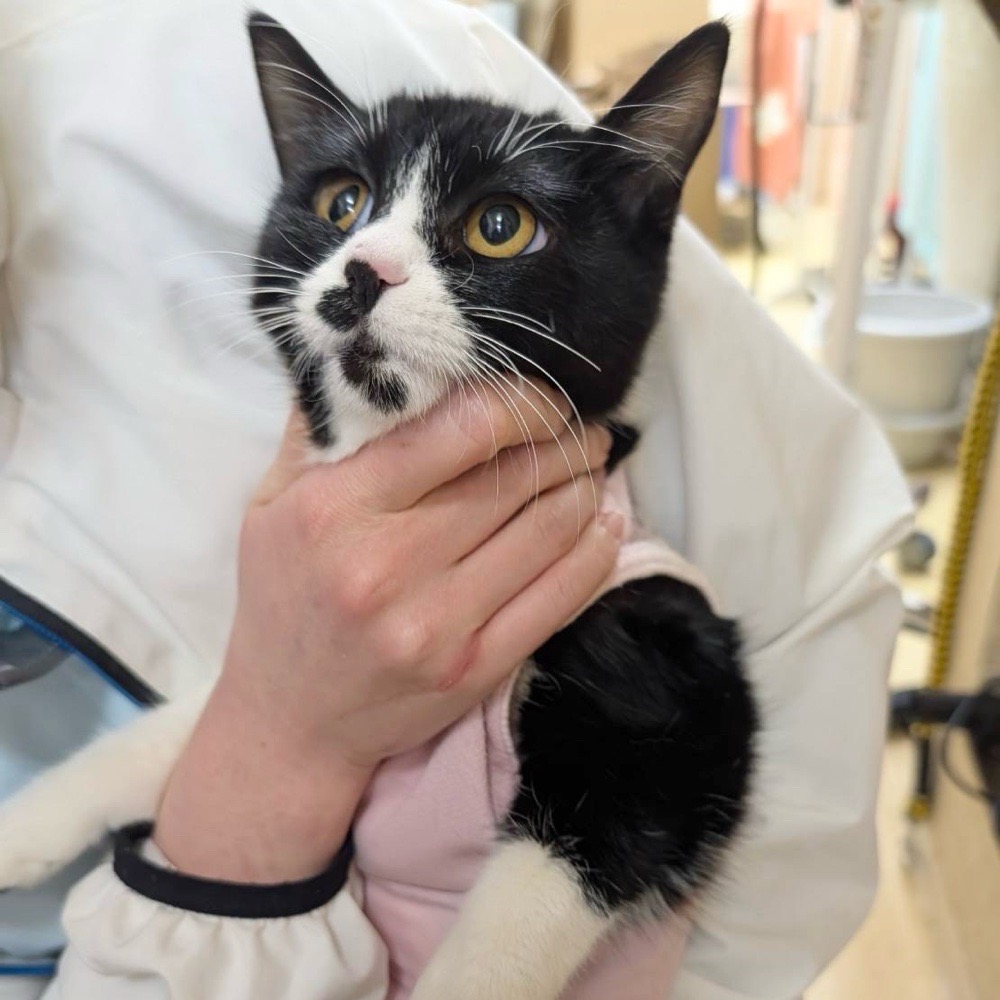 - 一緒に保護した4匹の中で一番大柄でお口周りの模様が個性的な女の子です。人間が関わっていた場所から保護したので、人には慣れていますが、堂々とした?見た目に反して、一番長くシャーシャーしていたのがてんかすちゃんです(笑)初めは緊張していましたが、すっかり新しい環境にも慣れてきて、最近は甘えるようになってきました!抱っこされて撫でられるのもまんざらではないようです。