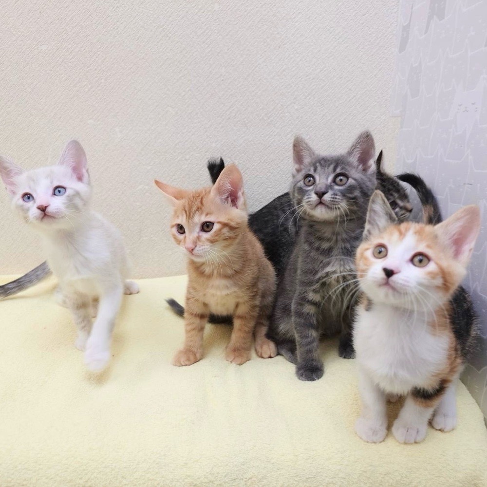 同世代の子猫たち8匹で一緒にいるので、みんなで毎日元気一杯に遊んでいます。まだまだ子猫さんなので、これからますます個性が出てくると思います。どんな子に育つか保護主もとても楽しみです。