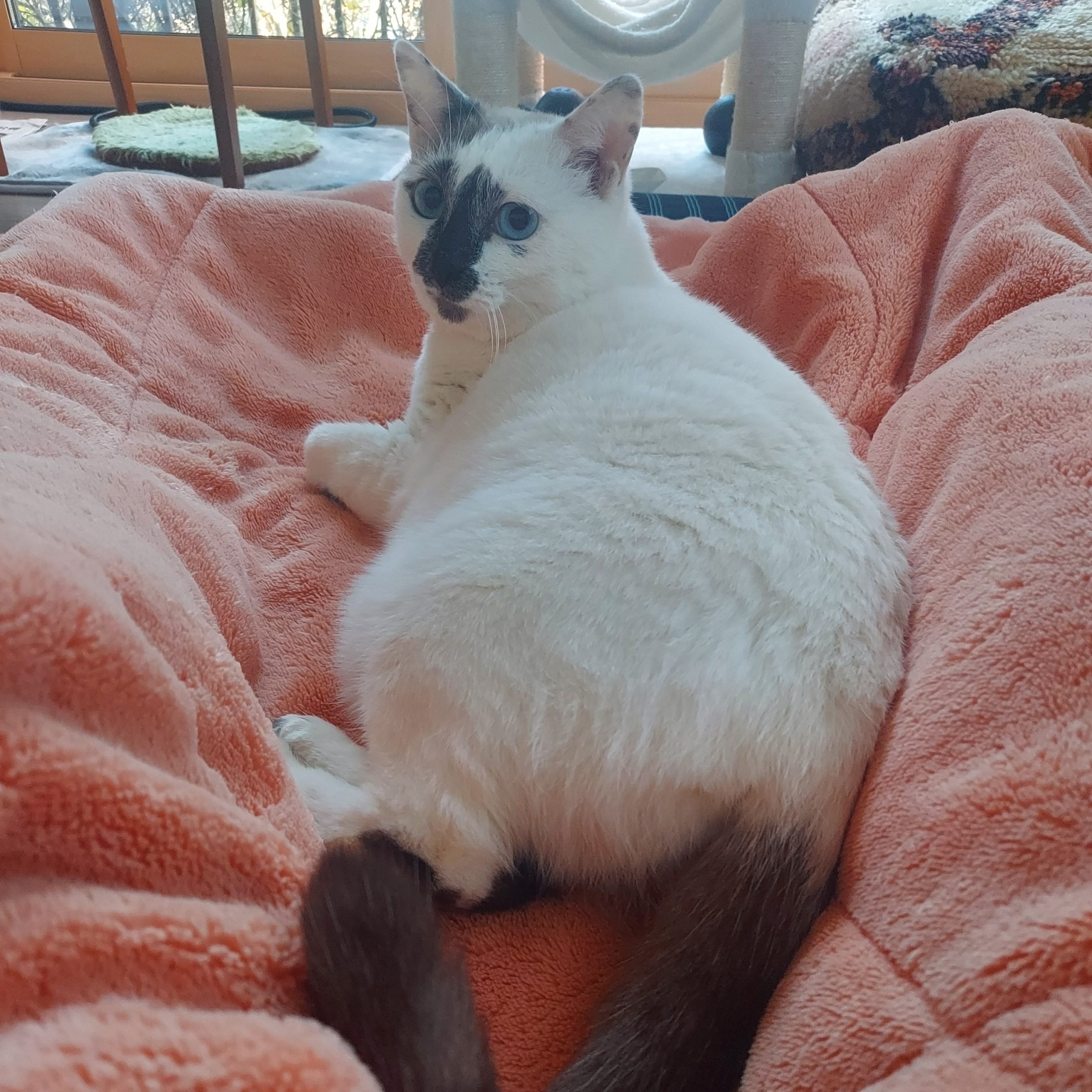 - 妊娠中に保護され、立派に3匹の子を育てました。子供達はそれぞれ新しい家族に迎えられ、元気に成長中です。頑張っためおと母も、新しい家族を見つける為に我が家へやって来ました。来た当時は拒否全開のシャー猫、出産後で色々な事に神経質になり、チュールを人の手から食べるのに半年、体に触れるのに1年と長い年月をかけ家慣れしている努力家さんです。