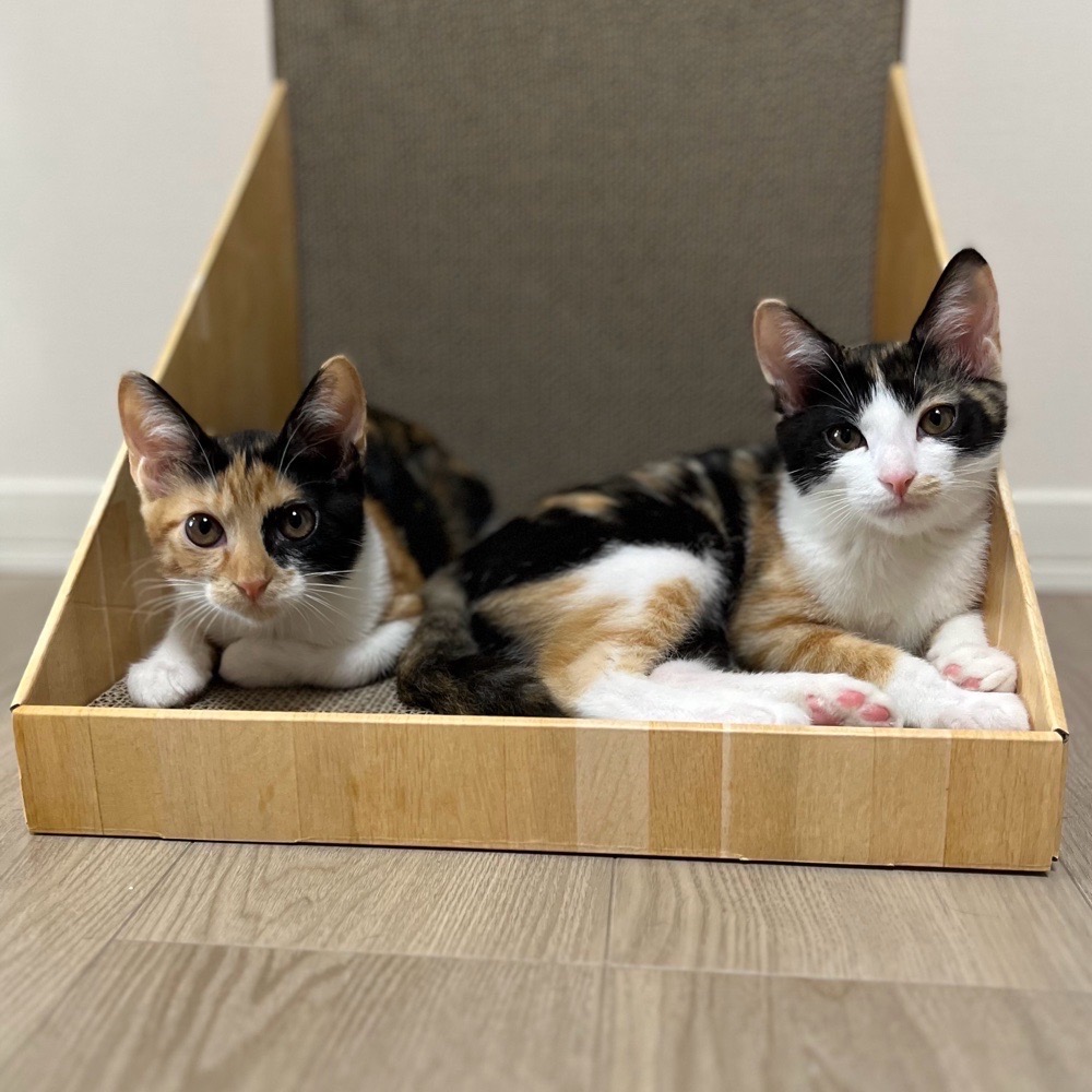同じミケ猫のエクラちゃんと仲良し姉妹です。お顔が茶黒のがコロレちゃん。1人でご機嫌に遊んでると思ったら急に隣に来てベタベタスリスリ甘えてきてくれるいわゆるツンデレさん!が、デレの方がかなり多めです(笑)お転婆さんでお気に入りのおもちゃを持つと意地でも渡さない自由な性格が魅力です。