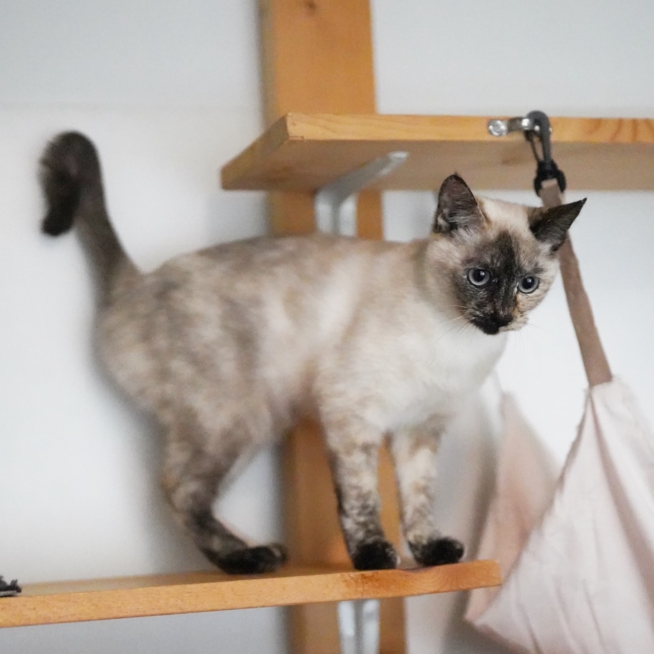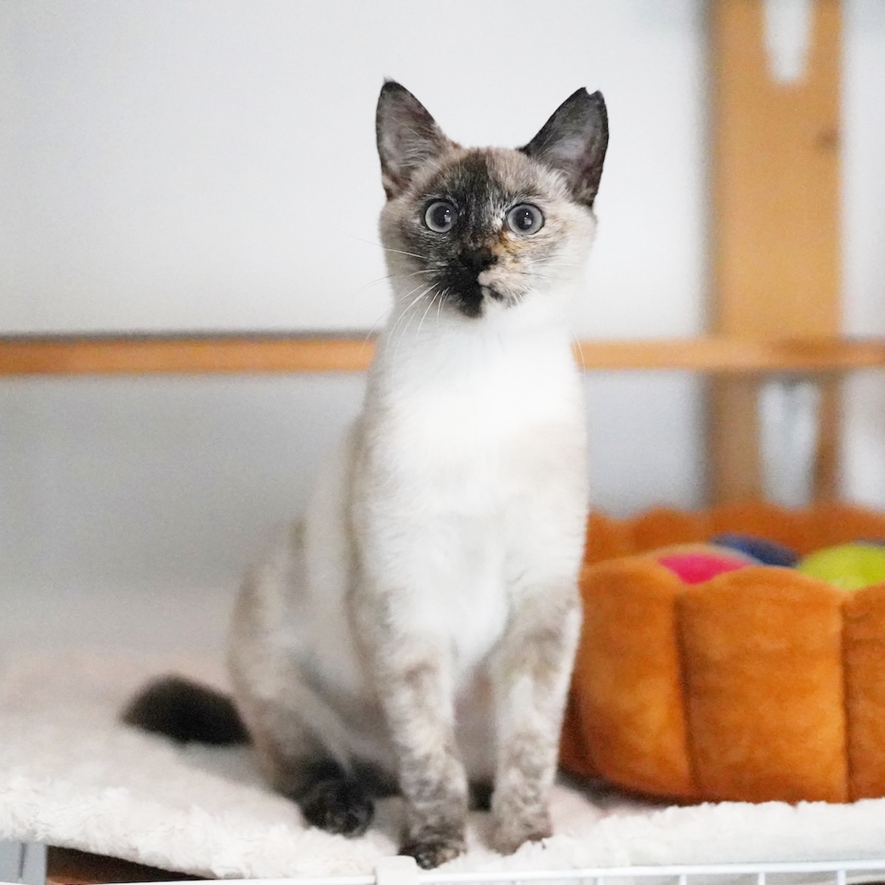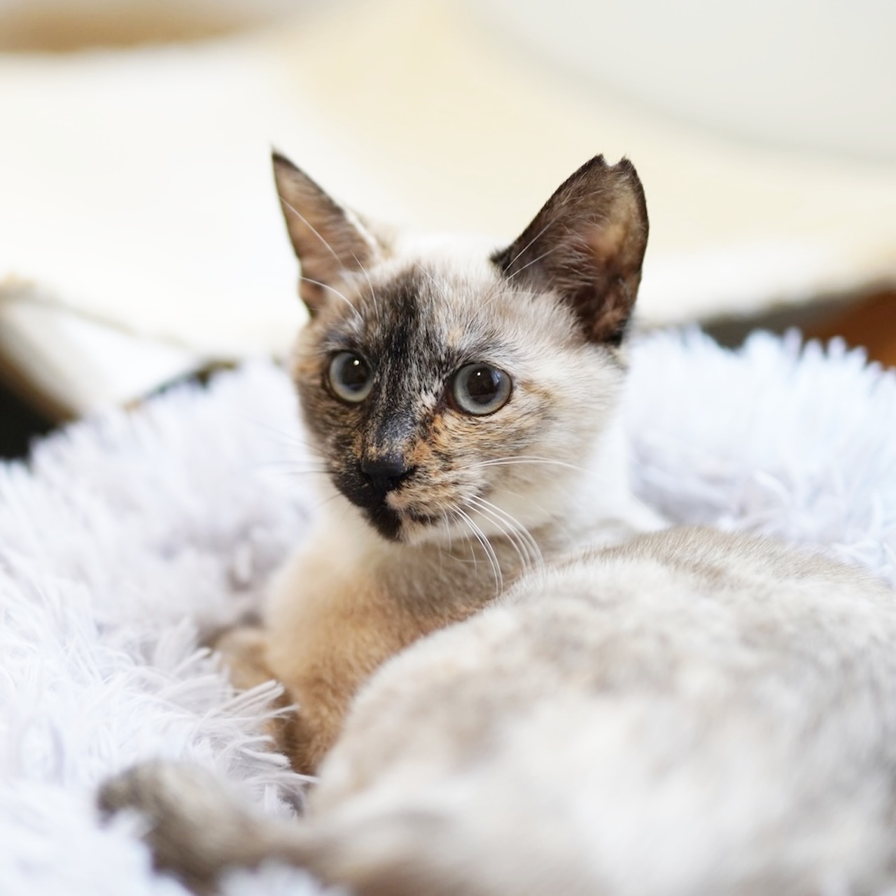 遊ぶのも大好きな、綺麗なブルーアイのシャムミックスの女の子です。